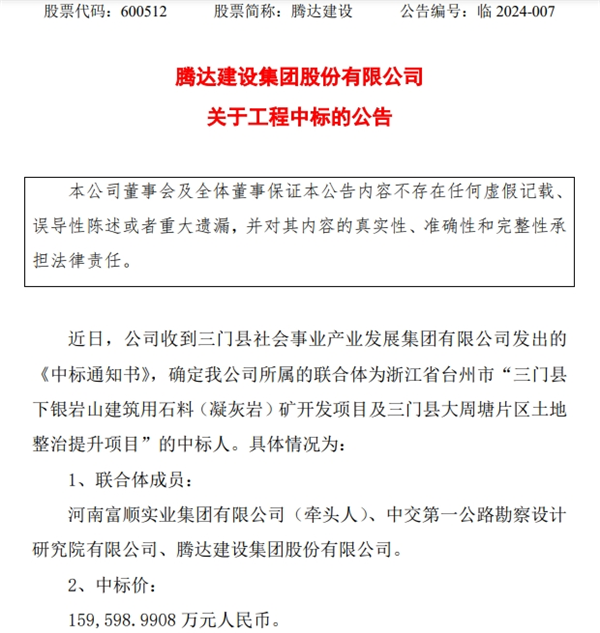 近日,獲悉,河南富順實(shí)業(yè)集團(tuán)(牽頭人)、中交第一公路勘察設(shè)計(jì)研究院、騰達(dá)建設(shè)集團(tuán)組成的民企+央企聯(lián)合體成功中標(biāo)浙江臺(tái)州三門年產(chǎn)990萬噸砂石開采及土地整治EPCMO工程總承包項(xiàng)目,中標(biāo)價(jià)近16億元。根據(jù)招標(biāo)計(jì)劃,該項(xiàng)目首次爆破作業(yè)時(shí)間為2024年4月,出料時(shí)間為2024年5月。
