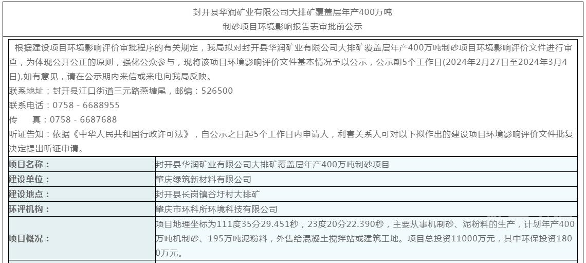 2月27日,廣東省肇慶市生態(tài)環(huán)境局封開分局發(fā)布《封開縣華潤礦業(yè)有限公司大排礦覆蓋層年產(chǎn)400萬噸制砂項(xiàng)目環(huán)境影響報(bào)告表審批前公示》。