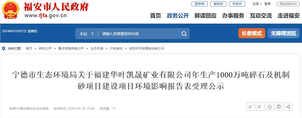 近日,福建省寧德市生態(tài)環(huán)境局發(fā)布福建華葉凱晟礦業(yè)有限公司年生產(chǎn)1000萬噸碎石及機制砂項目建設項目環(huán)評受理公示。