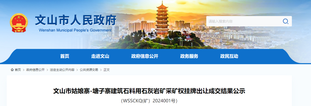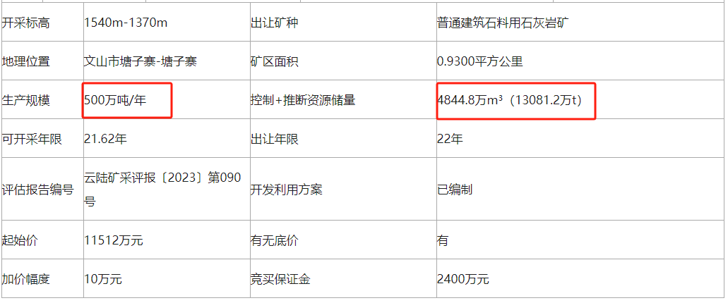 近日,云南省文山市人民政府發(fā)布文山市姑娘寨-塘子寨建筑石料用石灰?guī)r礦采礦權(quán)掛牌結(jié)果公告。興都資源開發(fā)管理有限公司以1.15億元成功競(jìng)得,該礦資源儲(chǔ)量超1.3億噸,生產(chǎn)規(guī)模500萬噸/年,出讓年限22年。