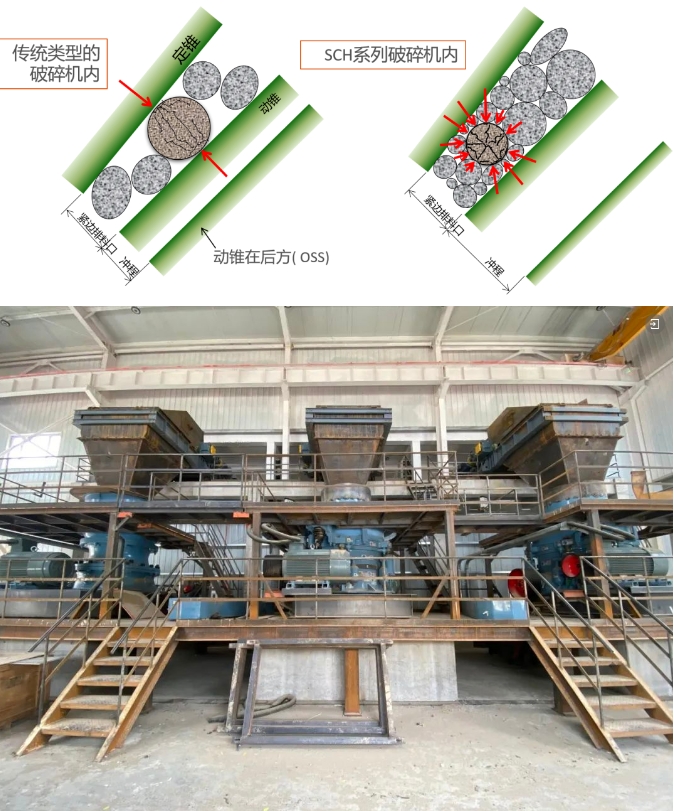 SCH系列多缸圓錐破碎機排料口鎖緊力大,可調節(jié)范圍寬,有較大的靈活性;排料口增大,破碎腔空間變大,產能隨之增大;產品形狀更整齊(正多面體形)、粒級更優(yōu)。