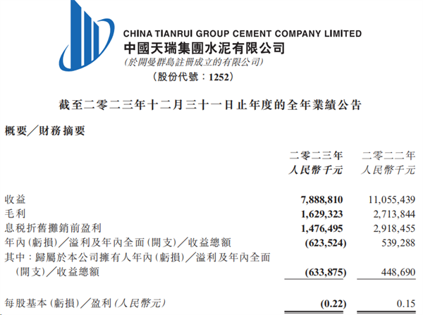 日前,中國天瑞集團水泥有限公司發(fā)布2023年度業(yè)績報告。該集團取得收益人民幣78.89億元,同比減少28.64%;公司擁有人應占虧損6.34億元,去年同期則溢利4.49億元。