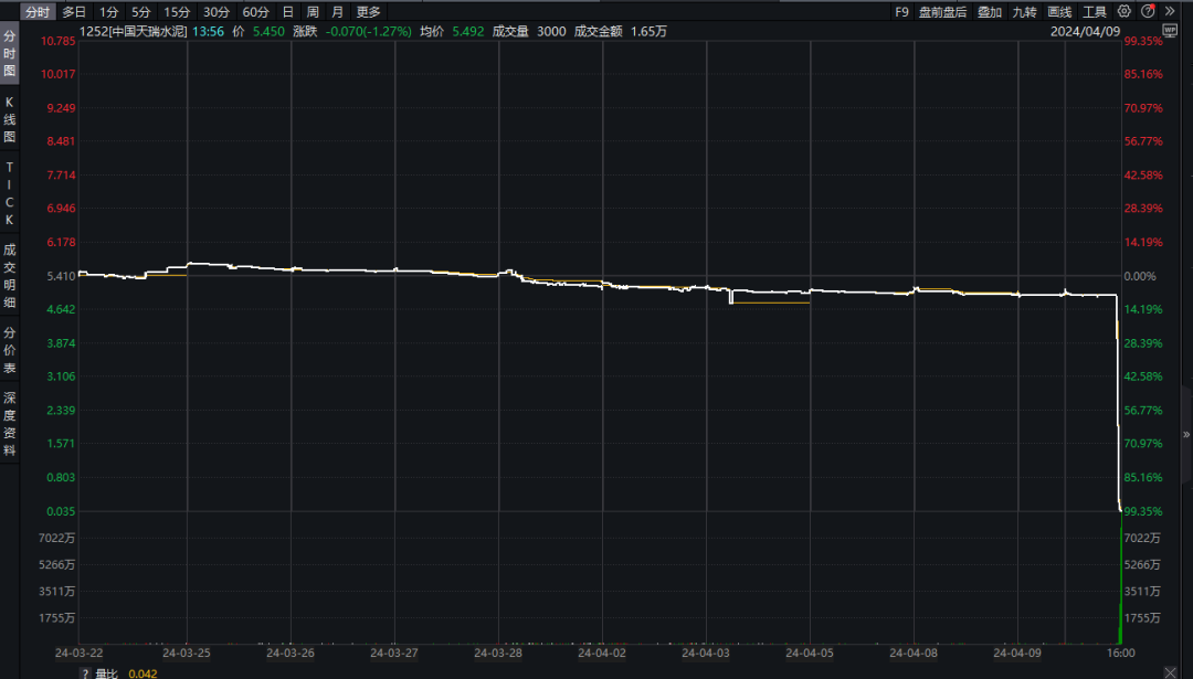 9日,中國(guó)水泥巨頭天瑞集團(tuán)在港股收盤前突然閃崩,股價(jià)暴跌99%,總市值只剩港幣1.4億元。一天內(nèi)蒸發(fā)145.48億元。從4.92港元/股跌至收盤價(jià)0.048港元/股。而在此之前,中國(guó)天瑞水泥股價(jià)表現(xiàn)平穩(wěn),交易稍顯清淡。