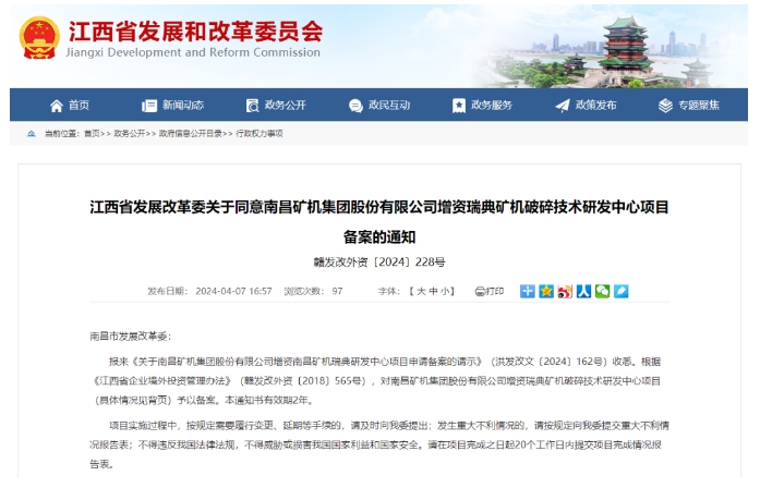 南礦集團(tuán)擬增資瑞典礦機(jī)破碎技術(shù)研發(fā)中心項目1200萬元近日,江西省發(fā)展改革委發(fā)布了《關(guān)于同意南昌礦機(jī)集團(tuán)股份有限公司增資瑞典礦機(jī)破碎技術(shù)研發(fā)中心項目備案的通知》。通知表示,根據(jù)《江西省企業(yè)境外投資管理辦法》(贛發(fā)改外資〔2018〕565號),對南昌礦機(jī)集團(tuán)股份有限公司增資瑞典礦機(jī)破碎技術(shù)研發(fā)中心項目予以備案。