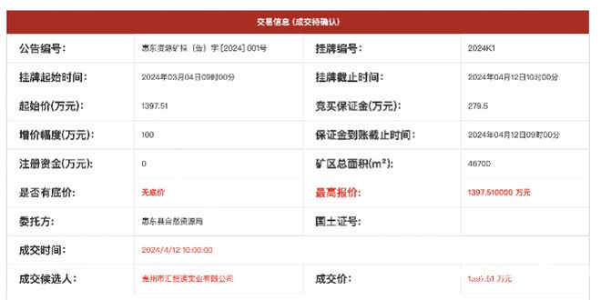 經(jīng)過中止再掛牌后,惠州交投礦業(yè)有限公司旗下子公司惠州市匯恒源實業(yè)有限公司,最終以1397.51萬元的底價競得惠東縣白花鎮(zhèn)樟山礦區(qū)建筑用花崗巖采礦權(quán)。