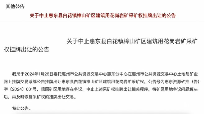 此前,白花鎮(zhèn)樟山礦區(qū)建筑用花崗巖采礦權(quán)曾被惠東自然資源局中止掛牌,2024年3月18日,惠東自然資源局發(fā)布公告,因白花鎮(zhèn)樟山礦區(qū)用地存在爭議,中止采礦權(quán)掛牌出讓相關(guān)程序,待礦區(qū)用地爭議問題解決后,再及時恢復采礦權(quán)的掛牌出讓交易。2024年3月28日,惠東縣自然局再度公告,稱礦區(qū)用地爭議問題已解決,決定恢復該采礦權(quán)的掛牌出讓活動,掛牌時間從2024年3月28日9時至2024年4月12日10時。
