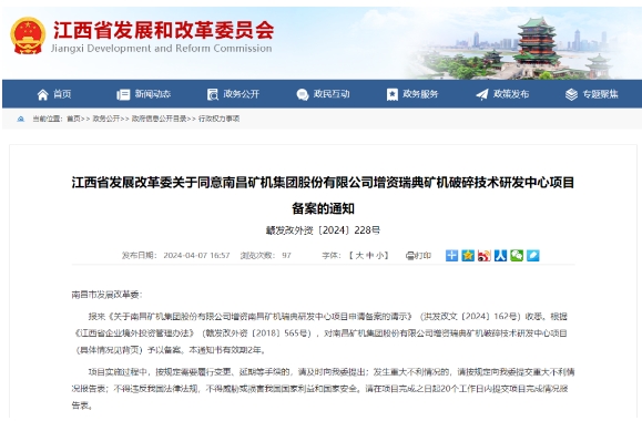 近日,江西省發(fā)展改革委發(fā)布了《關于同意南昌礦機集團股份有限公司增資瑞典礦機破碎技術研發(fā)中心項目備案的通知》。通知表示,根據(jù)《江西省企業(yè)境外投資管理辦法》(贛發(fā)改外資〔2018〕565號),對南昌礦機集團股份有限公司(下稱“南礦集團(001360)”)增資瑞典礦機破碎技術研發(fā)中心項目予以備案。