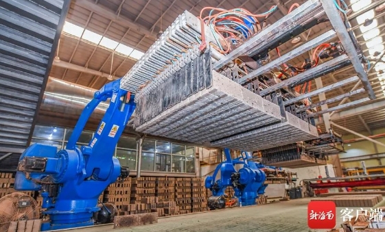 生產(chǎn)車間里,智能機(jī)械手正在搬運(yùn)磚坯。