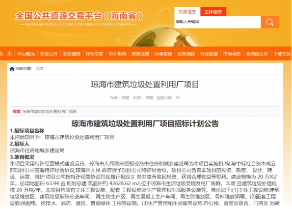 獲悉,瓊海市建筑垃圾處置利用廠項(xiàng)目特許經(jīng)營招標(biāo)計(jì)劃發(fā)布,項(xiàng)目投資12620.51萬元,建設(shè)建筑垃圾處理規(guī)模20萬噸/年,計(jì)劃于2024-12-31招標(biāo),公示如下: