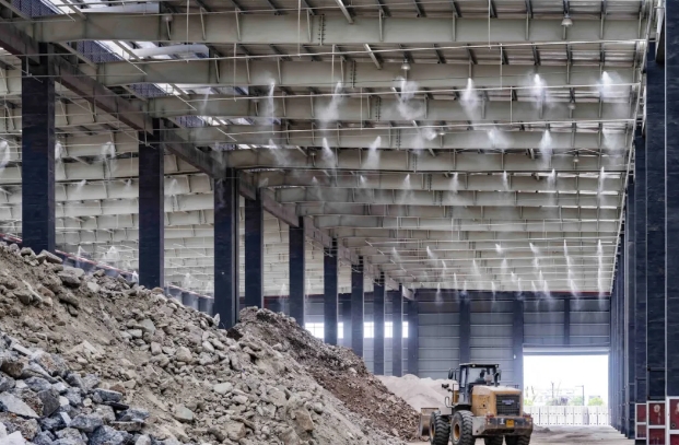 跟著車輛一路前進(jìn),首先來到處置中心的堆料車間。約9500平方米的室內(nèi)堆場上,自動噴淋系統(tǒng)正在根據(jù)空氣中的粉塵情況定時噴淋降塵,從車上卸下來的建筑垃圾、裝修垃圾等被堆成一座座小山丘,等待鏟車將它們送往處置車間。