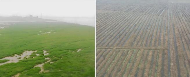 拼版照片:左圖為南洞庭湖自然濕地景觀(資料圖片),右圖為南洞庭湖挖溝抬壟現(xiàn)狀。(督察組供圖)