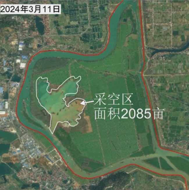 督察組查詢衛(wèi)星影像顯示,澧水河口濕地保護區(qū)孟姜垸洲灘被大面積采挖。(督察組供圖)