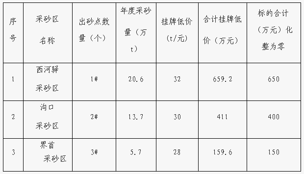 (1)西河驛采砂區(qū):長(zhǎng)1375米,平均寬度142米,年度采砂控制量為20.6萬(wàn)噸,掛牌低價(jià)32元/噸,合計(jì)掛牌低價(jià)659.2元,臨時(shí)堆砂點(diǎn)數(shù)量2個(gè)。