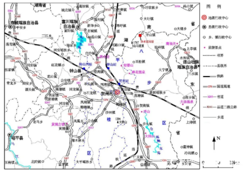 礦區位于賀州市25°方位,直距約35km處開山鎮分水村一帶,行政區劃隸屬賀州市八步區開山鎮管轄。礦區北東側有鄉村公路通過,由大寧鎮經桂嶺鎮通往開山鎮的公路從礦區南東側通過,礦區有約3km的簡易村道與周邊鄉鎮公路相通,沿國道G323至賀州市中心約76km,交通較方便。