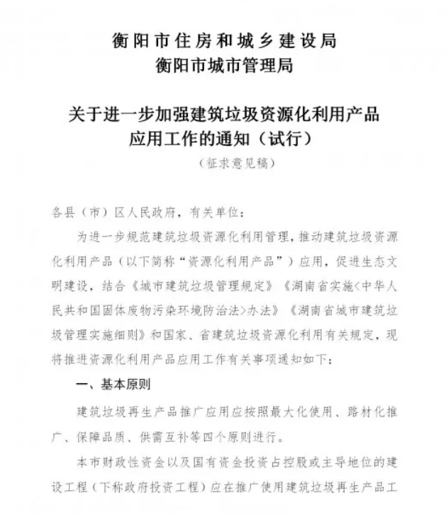 近日,湖南衡陽(yáng)市住房和城鄉(xiāng)建設(shè)局發(fā)布關(guān)于征求《關(guān)于進(jìn)一步加強(qiáng)建筑垃圾資源化利用產(chǎn)品應(yīng)用工作的通知(試行)》意見(jiàn)的通知,征求意見(jiàn)截止時(shí)間為2024年7月1日。