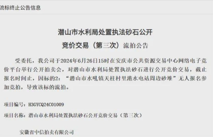 日前,安徽安慶潛山處置執(zhí)法砂石因無人報名流拍。該項目資源量合計約1.65萬噸,起拍價53.45萬元,測算單價約32.5元/噸。