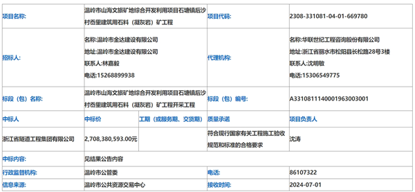 7月1日,浙江省隧道工程集團(tuán)有限公司成功中標(biāo)浙江省臺(tái)州市溫嶺市山海文旅礦地綜合開(kāi)發(fā)利用項(xiàng)目石塘鎮(zhèn)后沙村岙里建筑用石料(凝灰?guī)r)礦開(kāi)采工程,中標(biāo)價(jià)超27億元。