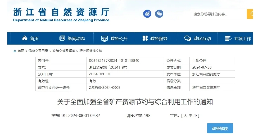 8月1日,浙江省自然資源廳發(fā)布《關(guān)于全面加強(qiáng)全省礦產(chǎn)資源節(jié)約與綜合利用工作的通知》。通知明確大力推廣先進(jìn)采礦方法,新建、改擴(kuò)建地下開(kāi)采固體礦山原則上應(yīng)采用充填法開(kāi)采,不能采用的應(yīng)嚴(yán)格論證。推廣尾礦制備新型建筑材料、尾礦充填等先進(jìn)適用技術(shù),推進(jìn)無(wú)尾礦山建設(shè)。該通知自2024年9月1日起施行。