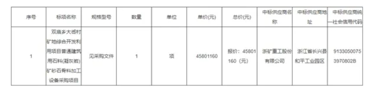 8月9日,浙江省臺(tái)州市公共資源交易中心發(fā)布雙廟鄉(xiāng)大岙村礦地綜合開發(fā)利用項(xiàng)目普通建筑用石料(凝灰?guī)r)礦砂石骨料加工設(shè)備采購項(xiàng)目中標(biāo)結(jié)果,浙礦重工股份有限公司以約4580萬元成功中標(biāo)。