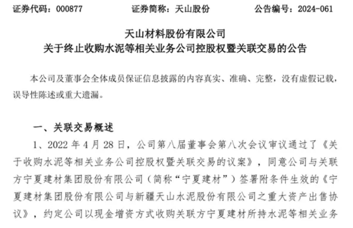 2022年4月,天山股份發(fā)布公告稱,擬以現(xiàn)金方式收購關聯(lián)方寧夏建材集團股份有限公司所持水泥等相關業(yè)務子公司的控股權等資產。