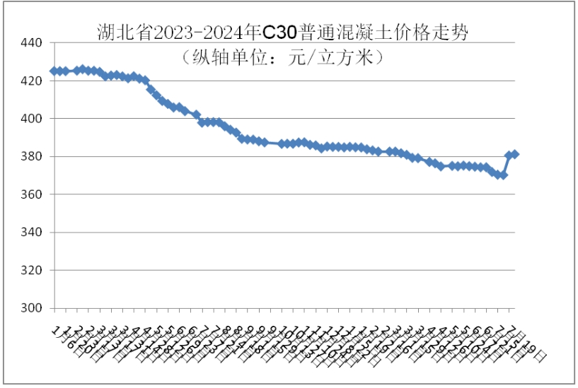 監(jiān)測(cè)數(shù)據(jù)顯示:7月份,強(qiáng)度等級(jí)C30普通混凝土全省均價(jià)為375.85元/立方米,環(huán)比上漲0.53%,同比下跌5.59%。下圖顯示7月19日之后全省混凝土均價(jià)上漲,因神農(nóng)架林區(qū)新建混凝土攪拌站,采集混凝土出廠價(jià)高于全省平均價(jià),帶動(dòng)全省均價(jià)上漲。
