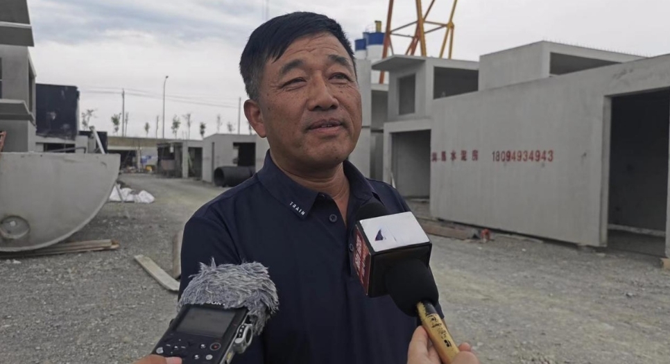 圖:塔城市潤昌商貿(mào)有限公司總經(jīng)理李興志介紹可循環(huán)裝配式水泥房的生產(chǎn)狀況
