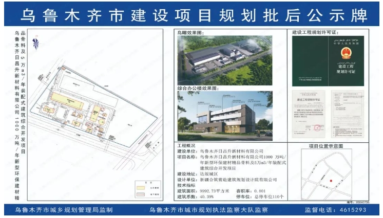 近日,烏魯木齊市人民政府發(fā)布烏魯木齊日昌升新材料有限公司1000萬噸/年新型環(huán)保建材精品骨料及5萬m?/年裝配式建筑綜合開發(fā)項目規(guī)劃批后公示。標志著該項目已經(jīng)通過了相關(guān)的審批,并且其規(guī)劃方案已經(jīng)確定,進入實施階段。