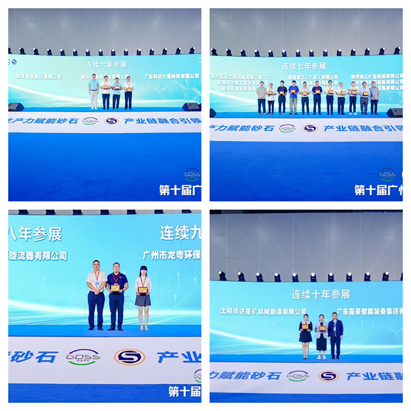 展會現(xiàn)場,主辦方廣東省砂石分會領(lǐng)導(dǎo)為連續(xù)參展六年、七年、八年、九年、十年的企業(yè)進(jìn)行頒獎。