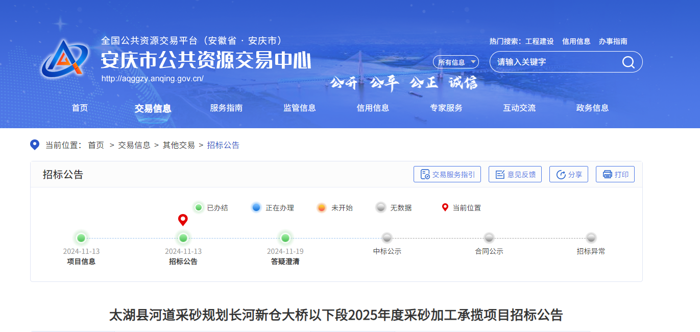 近日,安徽安慶市太湖縣河道采砂規(guī)劃長(zhǎng)河新倉(cāng)大橋以下段2025年度采砂加工承攬項(xiàng)目已獲批準(zhǔn),招標(biāo)人為太湖縣龍山產(chǎn)業(yè)投資有限公司。項(xiàng)目已具備招標(biāo)條件,現(xiàn)對(duì)該項(xiàng)目進(jìn)行公開(kāi)招標(biāo)。據(jù)悉,該項(xiàng)目位于長(zhǎng)河新倉(cāng)大橋以下段,可采區(qū)范圍長(zhǎng)4.434km,可采區(qū)面積125.12萬(wàn)平米,可采砂石總量240萬(wàn)立方米,年度控制開(kāi)采量80萬(wàn)立方米。合同簽字生效后至2025年12月31日止且總采砂量不超過(guò)120萬(wàn)噸,最高限價(jià)570萬(wàn)元。