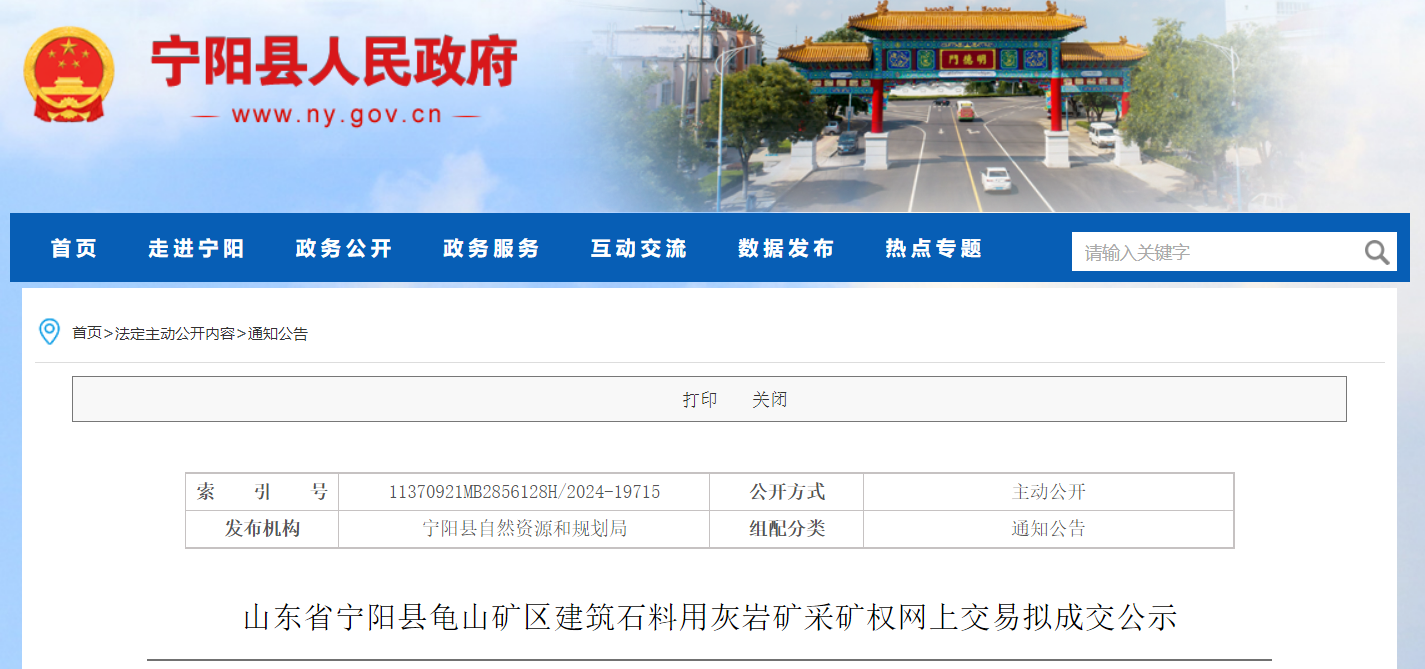 近日,山東省寧陽(yáng)縣自然資源和規(guī)劃局發(fā)布寧陽(yáng)縣龜山礦區(qū)建筑石料用灰?guī)r礦采礦權(quán)網(wǎng)上交易擬成交公示。