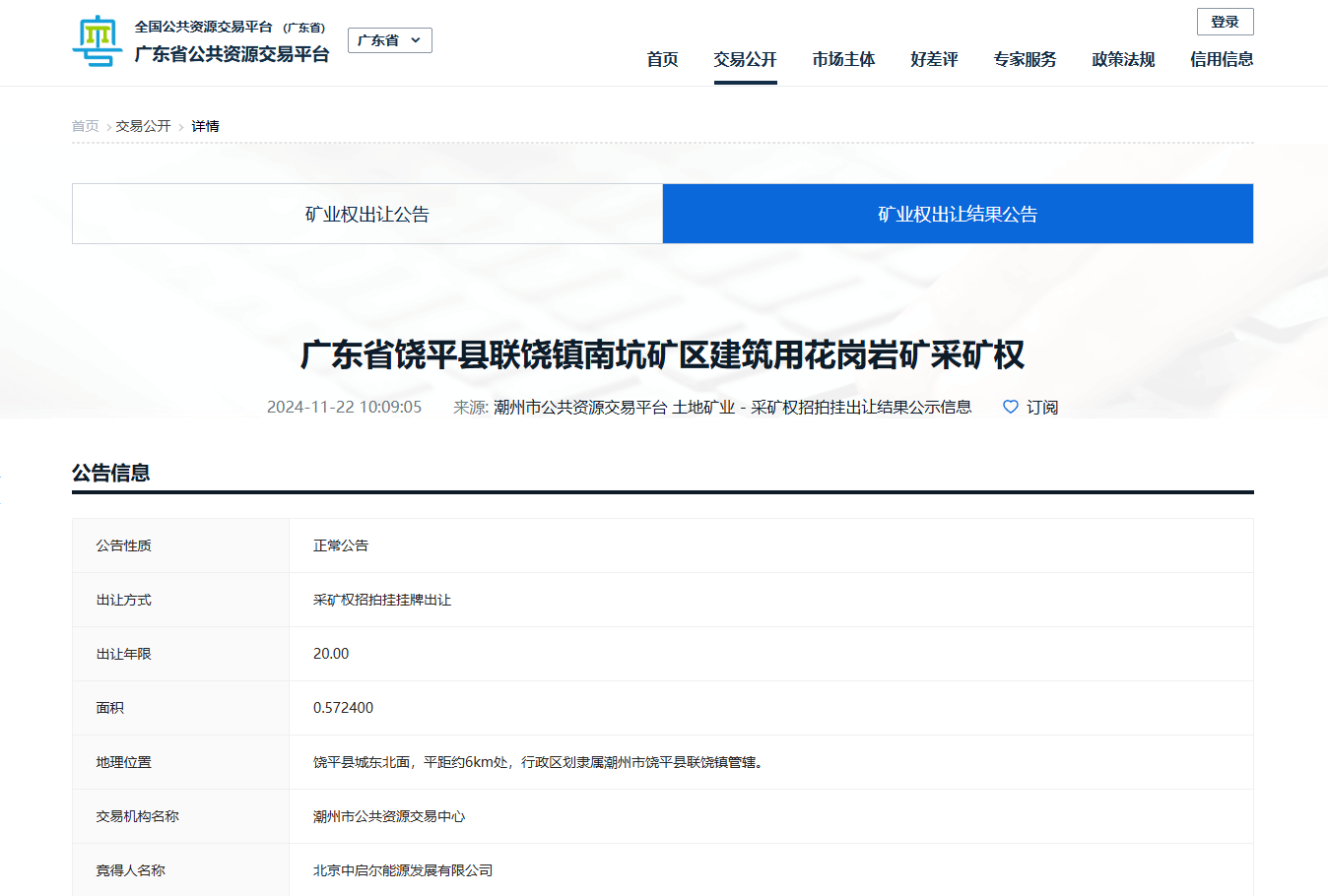 近日,潮州市公共資源交易平臺(tái)成功出讓廣東省饒平縣聯(lián)饒鎮(zhèn)南坑礦區(qū)建筑用花崗巖礦采礦權(quán)。此礦出讓年限為20年,生產(chǎn)規(guī)模為150萬(wàn)立方米/年,其中建筑用花崗巖2649.92萬(wàn)立方米。北京中啟爾能源發(fā)展有限公司最終以底價(jià)19400萬(wàn)元競(jìng)得此礦。