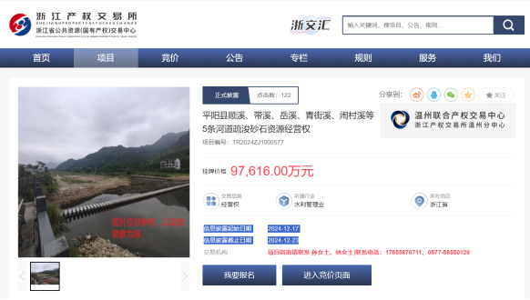 根據(jù)公告,該項目報名時間為2024年12月17至2024年12月23日下午5時止。成交后,競得人需在競價成交之日起60個工作日內(nèi)一次性支付全部費(fèi)用,具體以《平陽縣順溪、帶溪、岳溪、青街溪、鬧村溪等5條河道疏浚砂石資源經(jīng)營權(quán)轉(zhuǎn)讓合同》約定為準(zhǔn)。