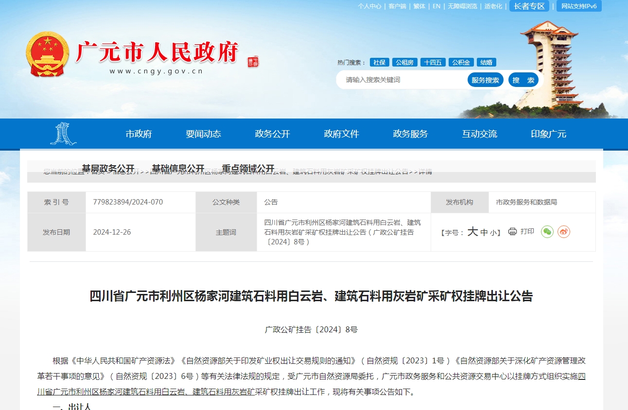 四川省廣元市利州區(qū)楊家河建筑石料用白云巖、建筑石料用灰?guī)r礦采礦權(quán)掛牌出讓公告 廣政公礦掛告〔2024〕8號(hào) 根據(jù)《中華人民共和國(guó)礦產(chǎn)資源法》《自然資源部關(guān)于印發(fā)礦業(yè)權(quán)出讓交易規(guī)則的通知》(自然資規(guī)〔2023〕1號(hào))《自然資源部關(guān)于深化礦產(chǎn)資源管理改革若干事項(xiàng)的意見(jiàn)》(自然資規(guī)〔2023〕6號(hào))等有關(guān)法律法規(guī)的規(guī)定,受廣元市自然資源局委托,廣元市政務(wù)服務(wù)和公共資源交易中心以掛牌方式組織實(shí)施四川省廣元市利州區(qū)楊家河建筑石料用白云巖、建筑石料用灰?guī)r礦采礦權(quán)掛牌出讓工作,現(xiàn)將有關(guān)事項(xiàng)公告如下。 一、出讓人 名稱:廣元市自然資源局 場(chǎng)所:廣元市利州區(qū)利州東路739號(hào) 二、礦業(yè)權(quán)交易平臺(tái) 名稱:廣元市政務(wù)服務(wù)和公共資源交易中心 場(chǎng)所:廣元市利州區(qū)玉潭路50號(hào)市政務(wù)服務(wù)和公共資源交易中心C區(qū)三樓 三、出讓采礦權(quán)基本情況 項(xiàng)目名稱:四川省廣元市利州區(qū)楊家河建筑石料用白云巖、建筑石料用灰?guī)r礦 開(kāi)采礦種:建筑石料用白云巖、建筑石料用灰?guī)r礦 地理位置:廣元市利州區(qū)雪峰街道金山村 面積:0.1543平方千米,拐點(diǎn)坐標(biāo)如下(2000國(guó)家大地坐標(biāo)): 開(kāi)采標(biāo)高:+960米至+790米 勘查工作程度:勘探 資源儲(chǔ)量:1649.6萬(wàn)噸(建筑石料用白云巖1541.7萬(wàn)噸、建筑石料用灰?guī)r礦107.9萬(wàn)噸)。 擬設(shè)生產(chǎn)規(guī)模:不低于150萬(wàn)噸/年。 擬出讓年限:不超過(guò)12年(含基建期1年,具體按評(píng)審?fù)ㄟ^(guò)的《礦產(chǎn)資源開(kāi)發(fā)利用方案》確定)。 資源開(kāi)發(fā)利用情況:擬出讓采礦權(quán)屬于已設(shè)采礦權(quán)注銷后重新出讓。 礦山地質(zhì)環(huán)境保護(hù)與土地復(fù)墾要求:按要求編制《礦山地質(zhì)環(huán)境保護(hù)與土地復(fù)墾方案》通過(guò)專家評(píng)審,開(kāi)采過(guò)程中嚴(yán)格按照通過(guò)的《礦山地質(zhì)環(huán)境保護(hù)與土地復(fù)墾方案》組織實(shí)施。 起始價(jià):人民幣3729萬(wàn)元 四、競(jìng)買人的資格條件 1.在中華人民共和國(guó)境內(nèi)注冊(cè)且具有獨(dú)立承擔(dān)民事責(zé)任的企業(yè)法人。 2.未被列入全國(guó)礦業(yè)權(quán)人勘查開(kāi)采信息公示系統(tǒng)中的“嚴(yán)重違法名單”;未被“信用中國(guó)”網(wǎng)站列入“失信懲戒對(duì)象”“重點(diǎn)關(guān)注名單”“安全生產(chǎn)領(lǐng)域失信生產(chǎn)經(jīng)營(yíng)單位”;未被“國(guó)家企業(yè)信用信息公示系統(tǒng)”列入“經(jīng)營(yíng)異常名錄”“嚴(yán)重違法失信企業(yè)名單”。 3.法律、行政法規(guī)規(guī)定的其他條件。 4.本次出讓不接受聯(lián)合體申請(qǐng)。 五、出讓方式及交易的時(shí)間、地點(diǎn) 出讓方式:掛牌 掛牌時(shí)間:2025年1月26日9時(shí)至2025年2月14日10時(shí) 地點(diǎn):廣元市利州區(qū)玉潭路50號(hào)市政務(wù)服務(wù)和公共資源交易中心C區(qū)三樓 六、獲取掛牌文件的途徑和申請(qǐng)報(bào)名的起止時(shí)間及方式 獲取出讓文件的途徑:競(jìng)買申請(qǐng)人須于2025年1月23日23時(shí)59分前通過(guò)賬號(hào)密碼或CA登錄全國(guó)公共資源交易平臺(tái)(四川省·廣元市)(http://www.gyggzyjy.cn/)電子交易平臺(tái)免費(fèi)下載出讓文件。CA數(shù)字證書辦理方式詳見(jiàn)全國(guó)公共資源交易平臺(tái)(四川省·廣元市)辦事指南(咨詢電話:0839-5572552)。 申請(qǐng)報(bào)名方式:本次掛牌出讓實(shí)行網(wǎng)上提交報(bào)名資料(不接受紙質(zhì)資料),報(bào)名資料須加蓋競(jìng)買申請(qǐng)人公章。競(jìng)買申請(qǐng)人須于2025年1月24日上午12:00前登錄全國(guó)公共資源交易平臺(tái)(四川省·廣元市)(http://www.gyggzyjy.cn/)提交報(bào)名資料,逾期提交報(bào)名資料的系統(tǒng)不予接受。申請(qǐng)人提交的報(bào)名資料必須真實(shí)、合法、有效,如申請(qǐng)人提交虛假報(bào)名資料將承擔(dān)法律責(zé)任(咨詢電話:0839-5572009)。 競(jìng)買保證金交納:本次掛牌出讓須交納競(jìng)買保證金人民幣柒佰肆拾陸萬(wàn)元整(¥7460000.00元)。申請(qǐng)人須于北京時(shí)間2025年1月24日上午10:00前通過(guò)申請(qǐng)人的賬戶以銀行轉(zhuǎn)賬、電匯、網(wǎng)上銀行轉(zhuǎn)賬方式足額交納競(jìng)買保證金,競(jìng)買保證金到達(dá)指定賬戶的時(shí)間以銀行到賬時(shí)間為準(zhǔn)。競(jìng)買保證金交納信息須登錄全國(guó)公共資源交易平臺(tái)(四川省?廣元市)—電子交易平臺(tái),從土地(礦權(quán))交易欄目“查看保證金”模塊中查詢。 七、確定競(jìng)得人的標(biāo)準(zhǔn)和方法 本次掛牌采用無(wú)底價(jià)增價(jià)方式掛牌出讓,價(jià)高者得。 八、風(fēng)險(xiǎn)提示 1.競(jìng)買人應(yīng)遵循“公平公正、誠(chéng)實(shí)信用”的原則參與本次礦業(yè)權(quán)出讓競(jìng)買,對(duì)所提交的文件和其他資料的真實(shí)性、合法性負(fù)責(zé)。對(duì)違反公共資源交易法律法規(guī),違背誠(chéng)實(shí)信用原則的競(jìng)買人,將按規(guī)定對(duì)