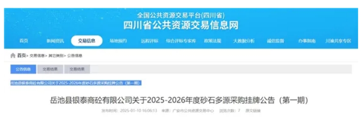 1月10日,四川省公共資源交易信息網(wǎng)發(fā)布岳池縣銀泰商砼有限公司關(guān)于2025-2026年度砂石多源采購(gòu)掛牌公告(第一期),主要采購(gòu)山碎石、碎石約27萬(wàn)噸,石粉約25萬(wàn)噸,天然砂(河砂)約5萬(wàn)噸,供應(yīng)期1年。 根據(jù)公告,本期收購(gòu)價(jià)格為山碎石80元/噸(規(guī)格10mm-25mm)、山碎石細(xì)石(需整形)(5mm-10mm)83元/噸、山碎石機(jī)制砂(精品石粉)86元/噸、卵碎石77元/噸、卵石機(jī)制砂(卵石粉)82元/噸、天然砂(河砂)108元/噸。以上價(jià)格于2025年1月10日17時(shí)00分生效,均含稅含運(yùn)費(fèi)等。 在供應(yīng)期間內(nèi),采購(gòu)方將定期抽查供應(yīng)商,一旦被工商行政主管部門(mén)列入經(jīng)營(yíng)異常名錄、嚴(yán)重違法失信企業(yè)名單(黑名單);被全國(guó)法院列入失信人被執(zhí)行名錄;被列入政府采購(gòu)嚴(yán)重違法失信行為記錄名單;采購(gòu)方將取消其供應(yīng)資格。 據(jù)悉,岳池縣銀泰商砼有限公司是岳池發(fā)展建設(shè)集團(tuán)有限公司全資子公司,成立于2016年11月,注冊(cè)資金1億元,位于四川省廣安市岳池縣白廟鎮(zhèn)黃蓮橋村17組。公司主營(yíng)預(yù)拌商品混凝土、預(yù)拌砂漿生產(chǎn)及銷售等,具有國(guó)家預(yù)拌商品混凝土專業(yè)承包資質(zhì),主要生產(chǎn)C15-C60等十余種型號(hào)混凝土。