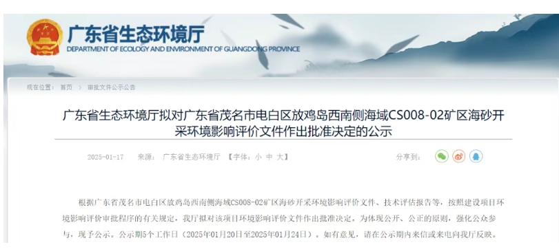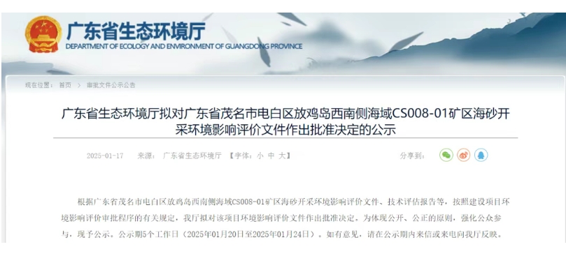 近日,廣東省生態(tài)環(huán)境廳擬對(duì)廣東省茂名市電白區(qū)放雞島西南側(cè)海域CS008-01、CS008-02礦區(qū)海砂開采環(huán)境影響評(píng)價(jià)文件作出批準(zhǔn)決定的公示。根據(jù)報(bào)告顯示,兩宗海砂礦權(quán)最大資源可開采量5216.97萬方,年產(chǎn)1921萬方,詳情如下: CS008-01礦區(qū),最大資源可開采原礦礦石量為2322.31萬m³,年均最大開采量854萬m³,預(yù)計(jì)開采年限2.72年。 CS008-02礦區(qū),最大資源可開采原礦礦石量為2894.66萬m³,年均最大開采量1067萬m³,預(yù)計(jì)開采年限2.71年。 項(xiàng)目開采范圍用海面積為191.9801公頃,不占用岸線與灘涂。項(xiàng)目設(shè)計(jì)日最大開采量6.48萬m³、年均最大開采量854萬m³,設(shè)計(jì)最大資源可開采原礦礦石量為2322.31萬m³,預(yù)計(jì)開采年限2.72年。 項(xiàng)目為水下開采,采用4艘采砂能力為900m³/h的射流抽吸式采砂船、8艘4000m³皮帶運(yùn)砂船進(jìn)行作業(yè),礦區(qū)存在兩個(gè)礦體,先開采V1礦體,后開采V2礦體。 茂名海域CS008-01海砂開采區(qū)塊地理位置圖 項(xiàng)目開采范圍用海面積為224.8184公頃,不占用岸線與灘涂。項(xiàng)目設(shè)計(jì)日最大開采量8.1萬m³、年均最大開采量1067萬m³,設(shè)計(jì)最大資源可開采原礦礦石量為2894.66萬m³,預(yù)計(jì)開采年限2.71年。 項(xiàng)目為水下開采,采用5艘采砂能力為900m³/h的射流抽吸式采砂船、10艘4000m³皮帶運(yùn)砂船進(jìn)行作業(yè),礦區(qū)存在三個(gè)礦體,開采順序依次是V1礦體、V2礦體、V3礦體。 茂名海域CS008-02海砂開采區(qū)地理位置圖 公示期5個(gè)工作日(2025年01月20日至2025年01月24日)。如有意見,請(qǐng)?jiān)诠酒趦?nèi)來信或來電向我廳反映。 聯(lián)系地址:廣州市天河區(qū)龍口西路213號(hào)廣東省生態(tài)環(huán)境廳政務(wù)服務(wù)窗口,郵編:510630 聯(lián)系電話:020-83624746,020-83629853 傳真:020-87532166