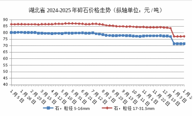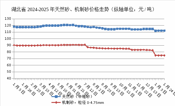 據(jù)了解,近日湖北省價格監(jiān)測中心發(fā)布2025年1月份湖北市場砂石骨料格。據(jù)監(jiān)測數(shù)據(jù)顯示:1月份,天然砂(中粗砂)、機制砂均價分別為112.12元/噸、74.86元/噸,碎石(粒徑5-16)、碎石(粒徑17-31.5)均價分別為71.49元/噸、77.19元/噸,價格整體下降。