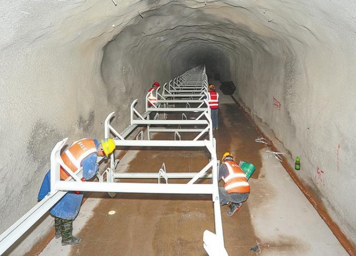2月18日,施工人員在隧道內(nèi)安裝膠帶運(yùn)輸機(jī)。