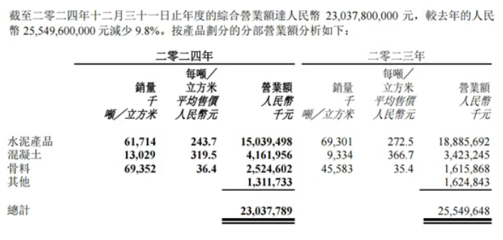 日前,華潤建材科技發(fā)布2024年年度業(yè)績報告。2024年,華潤建材科技取得營業(yè)額約230.38億元,同比減少9.8%;公司擁有人應(yīng)占盈利2.11億元,同比減少67.2。 在骨料銷售方面,2024年華潤建材科技對外銷量增加2376.9萬噸,銷售6935.2萬噸,較2023年增加52.14%。2024年骨料平均售價36.4元/噸,較2023年減少2.8%,綜合毛利率16.5%。 2024年,華潤建材科技水泥、混凝土及骨料生產(chǎn)線利用率分別為69.2%、33.9%及85.9%,而2023年則分別71.8%、25.9%及93.4%。 年報指出,截至2024年底,依托水泥礦山,華潤建材科技通過附屬公司擁有的在營(含試生產(chǎn))骨料年產(chǎn)能超1.08億噸,通過位于云南及福建的聯(lián)營公司股權(quán)權(quán)益擁有的應(yīng)占骨料年產(chǎn)能約370萬噸。全部建成后,華潤建材科技通過附屬公司掌握的骨料年產(chǎn)能預(yù)計將達近1.35億噸,通過聯(lián)營公司及合營公司股權(quán)權(quán)益掌控的應(yīng)占骨料年產(chǎn)能約1360萬噸。 毛利率35.1% 骨料平均售價36.4元/噸 據(jù)年報顯示,2024年華潤建材科技水泥產(chǎn)品、混凝土及骨料對外銷量減少760萬噸、增加370萬立方米及增加2380萬噸,較2023年分別減少10.9%、增加39.6%及增加52.1%。 2024年,華潤建材科技水泥產(chǎn)品、混凝土及骨料的平均售價分別為243.7元/噸、319.5元/方及36.4元/噸,較2023年分別減少10.6%、減少12.9%及增加2.8%。 年報顯示,2024年華潤建材科技水泥產(chǎn)品、混凝土及骨料的毛利率分別為15.1%、12.2%及35.1%,而2023年則分別為11.7%、11.9%及54.3%。 2024年,華潤建材科技綜合毛利38億元,較2023年的37.62億元增加1%,而綜合毛利率為16.5%,較2023年的14.7%增加1.8百分點。 2024年新增骨料產(chǎn)能1900萬噸 在骨料業(yè)務(wù)方面,2024年,華潤建材科技積極把握新業(yè)務(wù)發(fā)展機會,充分發(fā)揮水泥、骨料、混凝土的一體化協(xié)同優(yōu)勢,骨料業(yè)務(wù)取得快速發(fā)展,業(yè)務(wù)結(jié)構(gòu)優(yōu)化初見成效,新增骨料產(chǎn)能1900萬噸。 2月,位于廣東肇慶市的潤盛石場正式竣工投產(chǎn),新增骨料年產(chǎn)能約200萬噸。 3月,位于廣西貴港市平南縣的混凝土項目配套骨料生產(chǎn)線正式竣工投產(chǎn),新增骨料年產(chǎn)能約200萬噸。 7月,位于廣西貴港市覃塘區(qū)的東葉山骨料項目正式竣工投產(chǎn),新增骨料年產(chǎn)能約500萬噸。 10月,位于廣西賀州市富川縣的伍仔山骨料項目正式竣工投產(chǎn),新增骨料年產(chǎn)能約200萬噸;同月,位于云南大理白族自治州巍山縣的骨料項目試生產(chǎn)產(chǎn),新增骨料年產(chǎn)能約300萬噸。 12月,位于湖北咸寧市崇陽縣的潤陽骨料項目試生產(chǎn),新增骨料年產(chǎn)能約500萬噸。