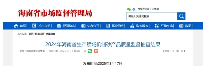 2024年,海南省市場監(jiān)督管理局對全省生產(chǎn)領(lǐng)域機制砂產(chǎn)品進行了監(jiān)督抽查。本次抽查了20批次產(chǎn)品,經(jīng)檢驗,不合格2批次,不合格率為10%。顆粒級配成為此次抽檢不合格的“重災(zāi)區(qū)”。 機制砂石產(chǎn)品質(zhì)量關(guān)乎我國居民建筑、工程質(zhì)量安全,近年來,中國砂石協(xié)會積極倡導(dǎo)行業(yè)企業(yè)建立砂石實驗室,從源頭控制產(chǎn)品質(zhì)量。實驗室建設(shè)按照《機制砂石生產(chǎn)企業(yè)實驗室基本條件》標(biāo)準進行,實驗室認定和建設(shè)工作,可咨詢中國砂石協(xié)會秘書處。 本次監(jiān)督抽查依據(jù)GB/T 14684-2022等標(biāo)準要求,對下列項目進行了檢驗:顆粒級配、MB值、石粉含量、泥塊含量、表觀密度、放射性核素限量、氯化物。本次抽查發(fā)現(xiàn)有2批次不符合標(biāo)準要求,涉及的不合格項目為:顆粒級配。 機制砂顆粒級配不合格易影響混凝土配合比,從而影響混凝土力學(xué)性能,給建筑工程質(zhì)量安全帶來較大安全隱患。本次抽查發(fā)現(xiàn)的不合格產(chǎn)品將移交被檢主體及產(chǎn)品標(biāo)稱的生產(chǎn)企業(yè)所在地市場監(jiān)管部門依法進行處理。 具體抽查結(jié)果如下: