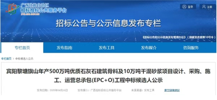 4月16日,廣西招投標公共服務平臺發(fā)布南寧交投賓陽黎塘旗山年產500萬噸優(yōu)質石灰石建筑骨料及10萬噸干混砂漿項目設計、采購、施工、運營總承包(EPC+O)中標候選人公示,公示截止時間為4月21日。中鐵二十三局集團有限公司、蘇交科集團股份有限公司聯合體成功中標該項目,投標報價近7.8億元。 項目位于南寧市賓陽縣黎塘鎮(zhèn),占地總計約1463畝(含輔助用地91畝),基建期及開采期總開采量約5681萬噸(其中可用礦石量5537萬噸、廢棄渣土約144萬噸),建設內容包含礦山基建開采、新建年產500萬噸建筑骨料生產線(生產線產能不少于1500t/h,其中制砂產能不小于375t/h,生產線具有整形功能)、骨料加工生產廠房、配套建設水、電、道路、設備購置安裝及其他附屬設施等。 據悉,2022年2月16日,南寧交投昆侖實業(yè)投資有限公司獲得該采礦權,成交價2.94億元。該礦區(qū)出讓范圍內資源儲量近1.5億噸,生產規(guī)模500萬噸/年,出讓年限29.8年(含基建期1.5年)。 該項目服務期限要求為12年。基建期為自中標通知書發(fā)出之日至2027年4月30日止,完成礦山基建工程及正式生產后區(qū)及生產線建設,生產線產能達到不低于1500t/h,其中制砂產能不低于375t/h,通過發(fā)包入及相關主管部門驗收,取得安全生產許可證。開采期從2027年5月1日至2037年4月30日止,完成總量不低于5000萬噸的礦產品生產,同時每年生產質量合格的礦產品不低于500萬噸(以招標人銷售要求為準)。 產品質量要求方面,設計符合現行有關設計規(guī)范和本項目設計要點的要求;設備符合國家及行業(yè)相關規(guī)定;施工符合國家、行業(yè)質量要求,驗收質量為合格工程,產品質量標準;產品符合國家及相關行業(yè)技術要求及發(fā)包人銷售需求。 招標范圍如下: 設計范圍: 滿足招標人就本項目確定的正式廠區(qū)及生產線、本項目正式廠區(qū)至外部道路之間的道路等施工圖設計(含施工圖預算),設計范圍:(1)生產規(guī)模投產年生產量不低于500萬噸骨料生產線(生產線產能不少于1500t/h,其中制砂產能不小于375t/h,生產線具有整形功能)及骨料工生產廠房;(2)骨料生產線車間及配套工程;(3)總圖、運輸工程;(4)公用與輔助設施工程;(5)其他配套工程;(6)本項目正式廠區(qū)至外部道路之間的道路等設計。 正式廠區(qū)及生產線施工范圍: 按照招標人提供的設計文件及審定的施工圖設計文件在基建期內完成正式廠區(qū)及骨料生產線施工,滿足廣西區(qū)綠色礦山、二級及以上安全標準化、達產達標(生產線產能不少于1500t/h,其中制砂產能不小于375t/h,生產線具有整形功能。)以及相關主管部門驗收合格。 (1)正式廠區(qū)及骨料生產線施工投標人負責土建工程(含樁基工程及地基處理)、裝飾裝修工程、安裝工程、機械設備安裝、本項目廠區(qū)至外部道路之間的道路施工。包括但不限于總圖工程、骨料生產線、電氣工程、給排水工程等,正式廠區(qū)及骨料生產線的建設必須滿足招標人年產量的要求。 (2)設備范圍:滿足招標人就本項目確定的建設產能目標所需的所有固定設備和輔助設施設備,包括但不限于本項目設計范圍內所有生產設備、機電設備、安全環(huán)保設備設施、除塵設備等以及其他輔助設備設施的設備采購與安裝,所供設備必須為全新設施設備。 礦石開采: 根據招標人礦山安全設施設計、礦山基建施工圖及招標文件相關要求完成礦山建設內容及礦石開采,礦山建設完成后需達到廣西區(qū)綠色礦山、二級及以上安全標準化以及相關主管部門驗收合格。基建及開采進度需結合招標人的銷售需求。 (1)礦山基建施工投標人負責按國家和地方的相關法律法規(guī)、標準及規(guī)范以及發(fā)包人提供的礦山相關建設技術方案、安全設施設計文件等資料進行礦山基建工程施工,完成清表、剝離、削頂、基建采準、運礦運廢道路建設等與本工程建設有關的所有內容并驗收合格。 (2)開采期礦石開采包括但不限于清表、鉆孔、剝離、爆破、含大塊礦石解小(<70cm)、鏟裝、運輸、卸礦、廢棄渣土棄置、平臺之間的聯絡工程、卸料平臺、作業(yè)平臺安全擋墻的修筑、截排水、礦山區(qū)域污水處理、臨近最終邊坡的控制爆破及邊坡修整、廢土廢石運至排土場等作業(yè)工序及其附屬設施建設、礦界外的滾石占地占林地及破壞農作物或經濟作物等賠償、協(xié)助進行礦山周邊關系維護協(xié)調、礦區(qū)外租地、協(xié)助招標人礦區(qū)內租地、礦山和排土場地質環(huán)境防治及監(jiān)測,以及礦山開采期間相關的安全、環(huán)保、職業(yè)衛(wèi)生管理、安全設施和費用的投入、土地復墾(含復綠)等相關工作等。 礦石破碎: 負責現場臨時生產線及年產量不低于500萬噸的骨料生產線生產所需的所有生產和相關輔助工作以及生產材料供應等,具體年產量、產品規(guī)格和產品質量以招標人銷售要求為準。 (1)在基建期投標人負責現場500t/h臨時生產線的改造及運行(生產符合招標文件質量要求的成品建筑骨料)、成品裝車、成品檢測等生產工序所包含的所有工作內容及所有輔助性工作。 (2)在開采期投標人負責正式廠區(qū)及骨料生產線的正常運行(年產不低于500萬噸質量合格的成品建筑骨料)、成品裝車、成品檢測等生產工序所包含的所有工作內容及所有輔助性工作。 其他服務范圍: 工程建設管理、