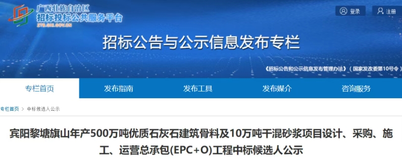 近日,根據(jù)廣西招投標(biāo)公共服務(wù)平臺發(fā)布信息,中鐵二十三局集團(tuán)有限公司、蘇交科集團(tuán)股份有限公司聯(lián)合體成功中標(biāo)南寧交投賓陽黎塘旗山年產(chǎn)500萬噸優(yōu)質(zhì)石灰石建筑骨料及10萬噸干混砂漿項(xiàng)目設(shè)計(jì)、采購、施工、運(yùn)營總承包(EPC+O),中標(biāo)金額為77892.6萬元。 項(xiàng)目位于南寧市賓陽縣黎塘鎮(zhèn),占地總計(jì)約1463畝(含輔助用地91畝),基建期及開采期總開采量約5681萬噸(其中可用礦石量5537萬噸、廢棄渣土約144萬噸),建設(shè)內(nèi)容包含礦山基建開采、新建年產(chǎn)500萬噸建筑骨料生產(chǎn)線(生產(chǎn)線產(chǎn)能不少于1500t/h,其中制砂產(chǎn)能不小于375t/h,生產(chǎn)線具有整形功能)、骨料加工生產(chǎn)廠房、配套建設(shè)水、電、道路、設(shè)備購置安裝及其他附屬設(shè)施等。 2022年2月16日,南寧交投昆侖實(shí)業(yè)投資有限公司以2.94億元獲得采礦權(quán),該礦區(qū)出讓范圍內(nèi)資源儲量近1.5億噸,生產(chǎn)規(guī)模500萬噸/年,出讓年限29.8年(含基建期1.5年)。 基建期為自中標(biāo)通知書發(fā)出之日至2027年4月30日止,完成礦山基建工程及正式生產(chǎn)后區(qū)及生產(chǎn)線建設(shè),生產(chǎn)線產(chǎn)能達(dá)到不低于1500t/h,其中制砂產(chǎn)能不低于375t/h,通過發(fā)包入及相關(guān)主管部門驗(yàn)收,取得安全生產(chǎn)許可證。
