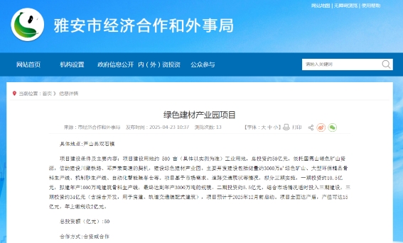 4月23日,雅安市經(jīng)濟(jì)合作和外事局發(fā)布蘆山縣雙石鎮(zhèn)綠色建材產(chǎn)業(yè)園項目招商情況,具體如下: 項目名稱:綠色建材產(chǎn)業(yè)園項目 具體地點:蘆山縣雙石鎮(zhèn) 項目建設(shè)條件及主要內(nèi)容: 項目建設(shè)用地約500畝(具體以實測為準(zhǔn))工業(yè)用地,總投資約50億元,依托國需山綠色礦山資源,借助建設(shè)川藏鐵路、邛蘆滎高速的契機(jī),建設(shè)綠色建材產(chǎn)業(yè)園。 主要開發(fā)建設(shè)包括儲量約3000萬m³綠色礦山、大型環(huán)保精品骨料生產(chǎn)線、機(jī)制砂生產(chǎn)線、自動化智能裝車倉等。 項目基于市場需求、道路交通現(xiàn)狀等情況,擬分三期實施: 一期投資約10.5億元,擬建年產(chǎn)1000萬噸建筑骨料生產(chǎn)線,最終達(dá)到年產(chǎn)3000萬噸的規(guī)模。 二期投資約5.5億元,結(jié)合市場情況適時投入三期建設(shè)。 三期投資約34億元(含綜合開發(fā),用于房建、軌道交通裝配式建筑)。 項目預(yù)計于2025年12月前啟動。項目全面達(dá)產(chǎn)后,產(chǎn)值可達(dá)15億元,年上繳稅收2億元。 總投資額(億元):50 合作方式:合資或合作 項目聯(lián)系人及聯(lián)系電話:蘆山縣投促中心0835-6526333 所屬縣區(qū):蘆山縣