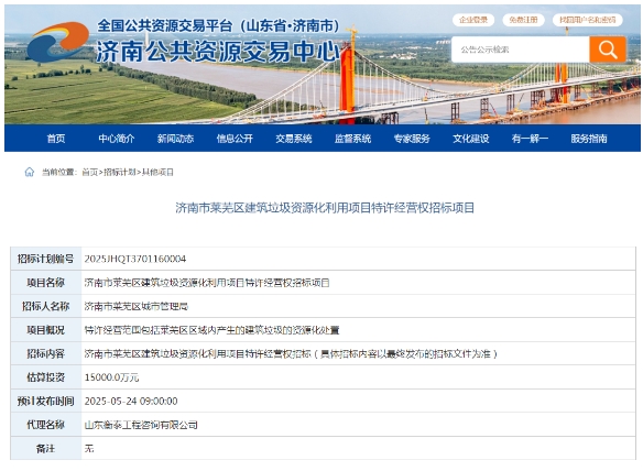 近日,濟(jì)南市萊蕪區(qū)建筑垃圾資源化利用項(xiàng)目特許經(jīng)營(yíng)權(quán)招標(biāo)項(xiàng)目發(fā)布公告,項(xiàng)目估算投資為15000萬(wàn)元,預(yù)計(jì)將于5月24日發(fā)布。 濟(jì)南市萊蕪區(qū)建筑垃圾資源化利用項(xiàng)目特許經(jīng)營(yíng)權(quán)招標(biāo)項(xiàng)目 招標(biāo)計(jì)劃編號(hào):2025JHQT3701160004 項(xiàng)目名稱:濟(jì)南市萊蕪區(qū)建筑垃圾資源化利用項(xiàng)目特許經(jīng)營(yíng)權(quán)招標(biāo)項(xiàng)目 招標(biāo)人名稱:濟(jì)南市萊蕪區(qū)城市管理局 項(xiàng)目概況:特許經(jīng)營(yíng)范圍包括萊蕪區(qū)區(qū)域內(nèi)產(chǎn)生的建筑垃圾的資源化處置 招標(biāo)內(nèi)容:濟(jì)南市萊蕪區(qū)建筑垃圾資源化利用項(xiàng)目特許經(jīng)營(yíng)權(quán)招標(biāo)(具體招標(biāo)內(nèi)容以最終發(fā)布的招標(biāo)文件為準(zhǔn)) 估算投資:15000.0萬(wàn)元 預(yù)計(jì)發(fā)布時(shí)間:2025-05-24 09:00:00 代理名稱:山東衡泰工程咨詢有限公司 備注:無(wú)