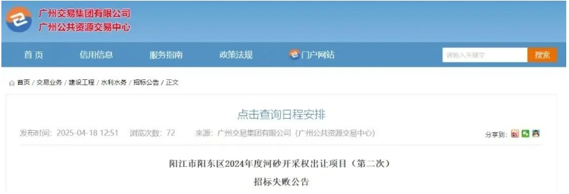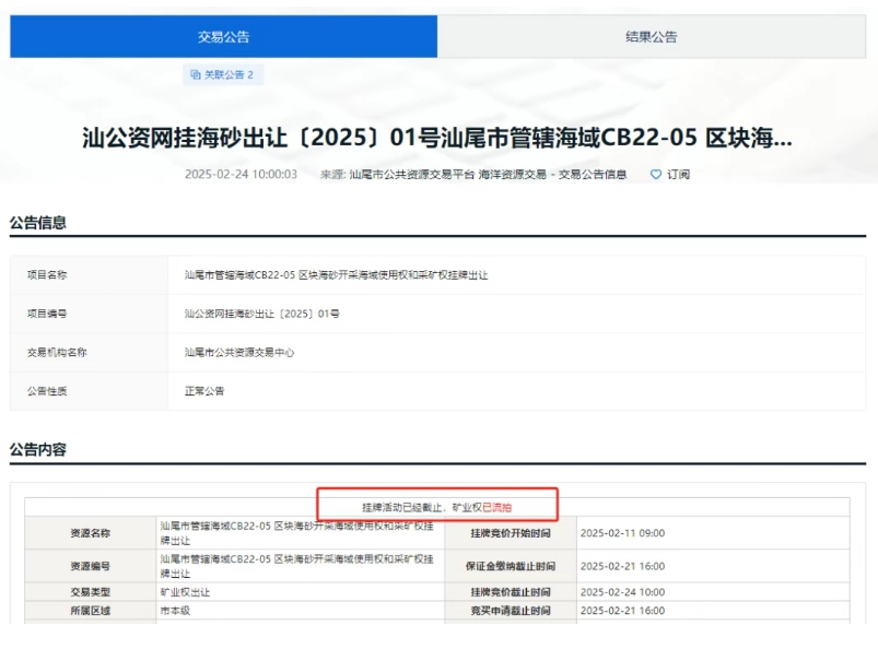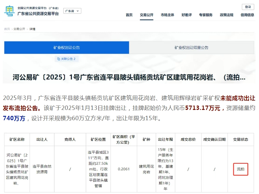 近年來(lái),隨著砂石行業(yè)進(jìn)入深度調(diào)整時(shí)期,即使是曾經(jīng)最為火爆的廣東砂石市場(chǎng)也出現(xiàn)低迷現(xiàn)象,就在2025年的前4個(gè)月中就有4宗礦權(quán)出現(xiàn)流拍、招標(biāo)失敗、中止出讓,總出讓起始價(jià)超13億元。 當(dāng)前,房地產(chǎn)和基建投資增速下降,砂石行業(yè)有效需求不足,行業(yè)面臨產(chǎn)能過(guò)剩,砂石礦山企業(yè)應(yīng)更加注重生產(chǎn)線建設(shè)的合理性與成本、石礦運(yùn)營(yíng)費(fèi)用的高低、銷售區(qū)域產(chǎn)能和市場(chǎng)需求量的大小、運(yùn)輸條件的好壞和運(yùn)輸費(fèi)用的高低、礦山投資的資金成本、對(duì)石礦運(yùn)營(yíng)的熟悉程度等因素,積極應(yīng)對(duì)行業(yè)挑戰(zhàn)! 2025年2月 2025年2月,汕尾市管轄海域CB22-05區(qū)塊海砂開(kāi)采海域使用權(quán)和采礦權(quán)流拍,據(jù)了解,此次為這宗海砂項(xiàng)目的第六次掛牌。首次終止、二次流拍,三次終止,四次流拍,五次終止,起始價(jià)“一降再降”。第六次出讓最終還是未能成功出讓。 據(jù)了解,CB22-05海砂開(kāi)采海域使用權(quán)和采礦權(quán)位于廣東省汕尾市陸豐市田尾角東南側(cè)管轄海域CB22-05區(qū)塊,海域面積2.12平方千米,海砂資源儲(chǔ)量2581.92萬(wàn)立方米,可采資源量2097.26萬(wàn)立方米。 本次海域使用權(quán)和采礦權(quán)出讓年限為3年,起始價(jià)為人民幣62917.8萬(wàn)元(其中:海域使用權(quán)起始價(jià)25305.54 萬(wàn)元,海砂采礦權(quán)起始價(jià)37612.26 萬(wàn)元)。 2025年3月 2025年3月,廣東省連平縣陂頭鎮(zhèn)楊貢坑礦區(qū)建筑用花崗巖、建筑用輝綠巖礦采礦權(quán)未能成功出讓發(fā)布流拍公告。該礦于2025年1月13日掛牌出讓,掛牌起始價(jià)為人民幣5713.17萬(wàn)元,資源儲(chǔ)量約740萬(wàn)方,設(shè)計(jì)開(kāi)采規(guī)模為60萬(wàn)立方米/年,出讓年限為15年。 該礦位于連平縣城區(qū)311°方向,直距約27.50km處,行政區(qū)劃隸屬連平縣陂頭鎮(zhèn)管轄。礦區(qū)范圍內(nèi)建筑用花崗巖保有控制的資源量619.22萬(wàn)立方米,推斷的資源量483.57萬(wàn)立方米;建筑用輝綠巖保有控制的資源量礦石量120.31萬(wàn)立方米,保有推斷的資源量礦石量32.51萬(wàn)立方米。 2025年4月 2025年4月,廣東陽(yáng)江市陽(yáng)東區(qū)2024年度河砂開(kāi)采權(quán)出讓項(xiàng)目(第二次)因沒(méi)有投標(biāo)單位辦理投標(biāo)登記,根據(jù)招標(biāo)文件及相關(guān)法律法規(guī)的規(guī)定,招標(biāo)失敗。 本次招標(biāo)包含三個(gè)可采區(qū),采區(qū)一控制開(kāi)采總量為24.1萬(wàn)方;采區(qū)二控制開(kāi)采總量為4.77萬(wàn)方;采區(qū)三控制開(kāi)采總量為1.73萬(wàn)方。總開(kāi)采量30.6萬(wàn)方。最高投標(biāo)限價(jià)2754萬(wàn)元。單價(jià)約90元/噸。 2025年4月1日,云浮市自然資源局發(fā)布廣東省云浮市云城區(qū)坳頭大窩坑區(qū)水泥用石灰?guī)r、溶劑用白云巖采礦權(quán)中止公告。 該礦確定的水泥用石灰?guī)r、熔劑用白云巖和水泥用配料類礦石可采儲(chǔ)量為28484.79萬(wàn)噸,其中水泥用石灰?guī)r礦17411.32萬(wàn)噸,熔劑用白云巖礦8428.90萬(wàn)噸,水泥配料類原料礦石量1461.09萬(wàn)立方米(2644.57萬(wàn)噸)。起始價(jià)65000萬(wàn)元,出讓年限30年。