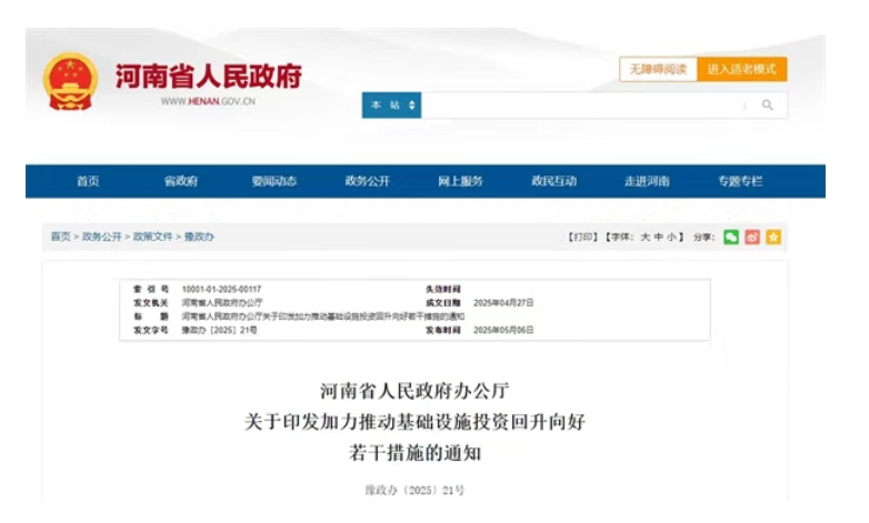 5月6日,河南省人民政府辦公廳印發(fā)關(guān)于加力推動(dòng)基礎(chǔ)設(shè)施投資回升向好若干措施的通知。通知提出,要加力推進(jìn)重大基礎(chǔ)設(shè)施項(xiàng)目建設(shè)。加快實(shí)施交通、能源、農(nóng)林、水利、城市、生態(tài)、物流、新型基礎(chǔ)設(shè)施等重大基礎(chǔ)設(shè)施項(xiàng)目。