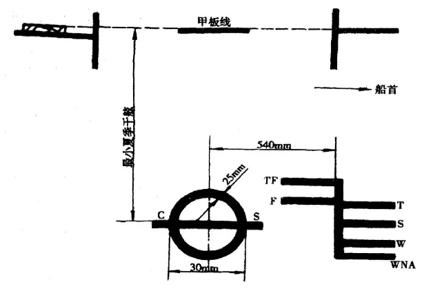 載重線標(biāo)志是為標(biāo)明船舶載重線位置,用以檢查裝載狀態(tài)使之不小于已核定的最小干舷。載重線標(biāo)志由三部分組成,圓環(huán)、與之相交的直線以及兩側(cè)的字母,圓環(huán)的中心位置位于船中,圓環(huán)中心距離甲板線的距離為最高一級(jí)航區(qū)干舷。 02、載重線的測(cè)量方法