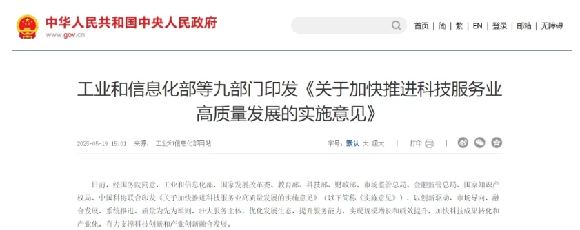 日前,經(jīng)國務(wù)院同意,工業(yè)和信息化部、國家發(fā)展改革委、教育部、科技部、財(cái)政部、市場監(jiān)管總局、金融監(jiān)管總局、國家知識產(chǎn)權(quán)局、中國科協(xié)聯(lián)合印發(fā)《關(guān)于加快推進(jìn)科技服務(wù)業(yè)高質(zhì)量發(fā)展的實(shí)施意見》(以下簡稱《實(shí)施意見》),以創(chuàng)新驅(qū)動、市場導(dǎo)向、融合發(fā)展、系統(tǒng)推進(jìn)、質(zhì)量為先為原則,壯大服務(wù)主體,優(yōu)化發(fā)展生態(tài),提升服務(wù)能力,實(shí)現(xiàn)規(guī)模增長和質(zhì)效提升,加快科技成果轉(zhuǎn)化和產(chǎn)業(yè)化,有力支撐科技創(chuàng)新和產(chǎn)業(yè)創(chuàng)新融合發(fā)展。