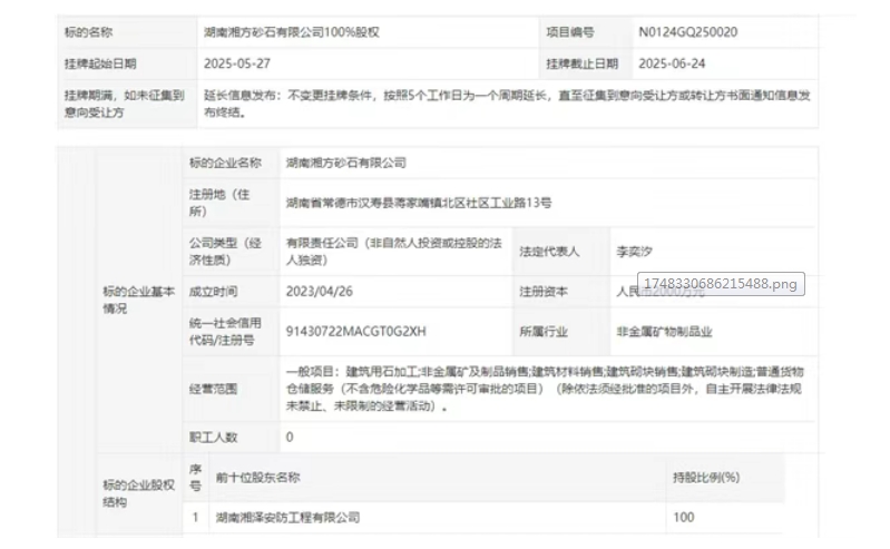 近日,湖南省聯合產權交易所發布湖南湘方砂石有限公司100%股權轉讓公告。據悉,截止2025年3月底,該公司資產總額2023.88萬元,負債總額約2029.19萬元,由湖南湘澤安防工程有限公司全資控股。此次掛牌價格116.12萬元,掛牌截止日期2025年6月24日。 根據湘恒明資評字(2025)第0002號評估報告,截止評估基準日2025年3月31日,轉讓方股東湖南湘江工程建設有限公司對標的企業享有的債權約2029.19萬元。本次股權轉讓受讓方須代標的企業償還上述欠款,并在《產權交易合同》簽訂之日起30日內將上述款項一次性匯入湖南聯交所指定賬戶。 據悉,湖南湘方砂石有限公司成立于2023年4月6日,注冊資本2000萬元,經營范圍包含建筑用石加工、非金屬礦及制品銷售、建筑材料銷售、建筑砌塊銷售、建筑砌塊制造、普通貨物倉儲服務等,成立至今未開展任何實質生成經營工作。 據了解,當下,由于砂石市場需求的收縮、產能過剩以及價格下跌,部分砂石企業正在經歷經營困難,已有企業正通過轉讓部分股權來調整資產結構。2025年5月初消息,山東地方國企為聚焦優勢主業,改善經濟狀況,轉讓7家砂石公司51%股權《詳見:洗牌倒計時?該地國資轉讓7家砂石子公司51%股權!》。 2025年5月底,又一國企轉讓旗下砂石公司全部股權,未來,隨著房地產與基建需求結構的不斷調整,可能會有更多砂石企業/礦山轉讓的情況。