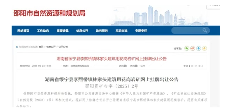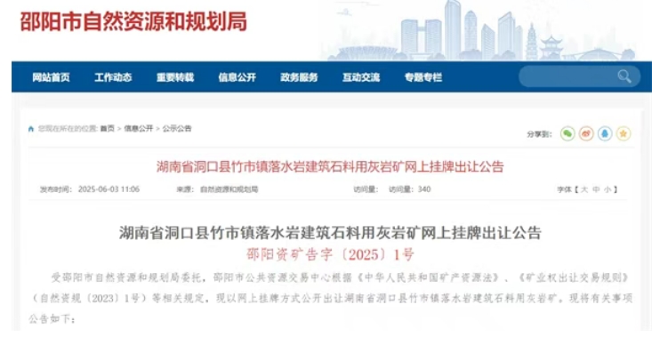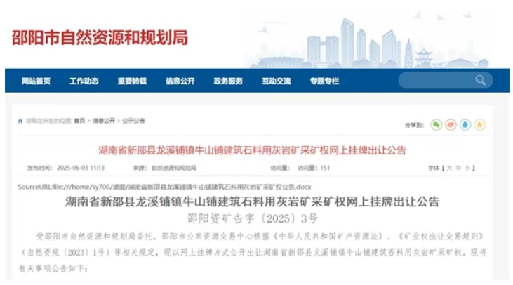 6月3日,湖南邵陽(yáng)自然資源和規(guī)劃局發(fā)布3宗砂石礦掛牌出讓信息。據(jù)悉,3宗砂石礦合計(jì)資源儲(chǔ)量4570萬(wàn)噸,年生產(chǎn)規(guī)模360萬(wàn)噸,掛牌起始價(jià)約1.56億元。另外,3宗砂石礦均為“凈礦”出讓?zhuān)?jìng)得人還須支付“凈礦”成本合計(jì)約9644.68萬(wàn)元,掛牌時(shí)間2025年7月7日-7月21日。經(jīng)計(jì)算,3宗砂石礦競(jìng)拍單價(jià)平均為5.52元/噸。 其中,湖南省洞口縣竹市鎮(zhèn)落水巖建筑石料用灰?guī)r礦年產(chǎn)能最高,180萬(wàn)噸/年; 湖南省綏寧縣李熙橋鎮(zhèn)林家頭建筑用花崗巖礦競(jìng)拍資源價(jià)款最高,5.86元/噸; 湖南省新邵縣龍溪鋪鎮(zhèn)牛山鋪建筑石料用灰?guī)r礦為整合出讓?zhuān)Y源價(jià)款及“凈礦”成本外,還須支付原采礦權(quán)資產(chǎn)處置價(jià)款約2704.17萬(wàn)元。 上述采礦權(quán)出讓收益首次征收比例為采礦權(quán)出讓成交價(jià)款的20%,采礦權(quán)人自愿一次性繳清的除外。 湖南省洞口縣竹市鎮(zhèn)落水巖建筑石料用灰?guī)r礦保有資源量2228.4萬(wàn)噸(837.7萬(wàn)立方米);采礦回采率98%,可采儲(chǔ)量為2183.8萬(wàn)噸(821萬(wàn)方),生產(chǎn)規(guī)模180萬(wàn)噸/年,擬出讓年限13.1(含礦山基建期1年),掛牌出讓起始價(jià)7644萬(wàn)元,“凈礦”出讓成本4786.09萬(wàn)元。經(jīng)計(jì)算,該項(xiàng)目噸成本5.57元。 湖南省綏寧縣李熙橋鎮(zhèn)林家頭建筑用花崗巖礦控制資源量1253.9萬(wàn)噸(537.9萬(wàn)方);采礦回采率98%,可采資源量為1205.9萬(wàn)噸,其中強(qiáng)風(fēng)化花崗巖礦447.3萬(wàn)噸、中風(fēng)化花崗巖礦100.4萬(wàn)噸、微風(fēng)化花崗巖礦658.2萬(wàn)噸。生產(chǎn)規(guī)模100萬(wàn)噸/年,擬出讓年限13.1年(含礦山基建期1年),掛牌出讓起始價(jià)4197萬(wàn)元,“凈礦”出讓3150.59萬(wàn)元,經(jīng)計(jì)算,該項(xiàng)目噸成本5.86元。 湖南省新邵縣龍溪鋪鎮(zhèn)牛山鋪建筑石料用灰?guī)r礦保有資源量1088.4萬(wàn)噸(401.6萬(wàn)方);采礦回采率98%,可采資源量為1066.6萬(wàn)噸(393.6萬(wàn)方)。生產(chǎn)規(guī)模80萬(wàn)噸/年,擬出讓年限14.3年(含礦山基建期1年),掛牌出讓起始價(jià)3735萬(wàn)元,“凈礦”出讓成本1708萬(wàn)元。經(jīng)計(jì)算,該項(xiàng)目噸成本5元。 另外,該項(xiàng)目為整合出讓?zhuān)?jìng)得人還須支付原采礦權(quán)資產(chǎn)處置價(jià)款2704.1668萬(wàn)元。該項(xiàng)目“凈礦”成本不包括露天采場(chǎng)、生產(chǎn)加工區(qū)等配套設(shè)施的土地租賃。