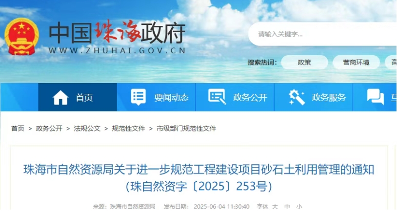 近日,珠海市自然資源局發(fā)布《關(guān)于進(jìn)一步規(guī)范工程建設(shè)項(xiàng)目砂石土利用管理的通知》(珠自然資字〔2025〕253 號(hào)),旨在進(jìn)一步規(guī)范工程建設(shè)項(xiàng)目砂石土利用管理工作,該通知經(jīng)市人民政府同意后正式實(shí)施。
